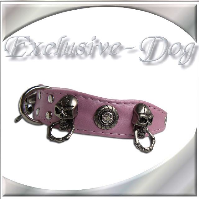 Rosa XS Hundehalsband, pinkes Totenkopf Lederhalsband für z.b. Chihuahua, Yorkshire-Terrier, Luxus Hund Skull Hundehalsband "Skull Candy"