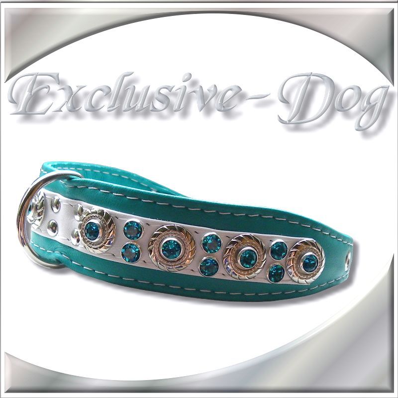 Dieses Strasshalsband wurde aus weiß /türkisgrünen Rossnappaleder hergestellt,