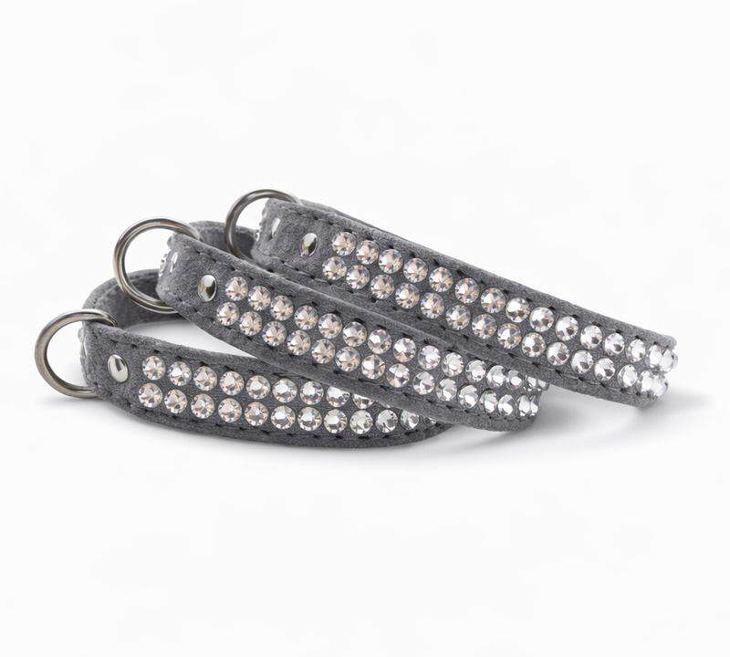 Diese kleinen Strasshalsbänder werden aus sehr weichem grauen Veloursleder gefertigt und mit hellem Leder unterlegt.